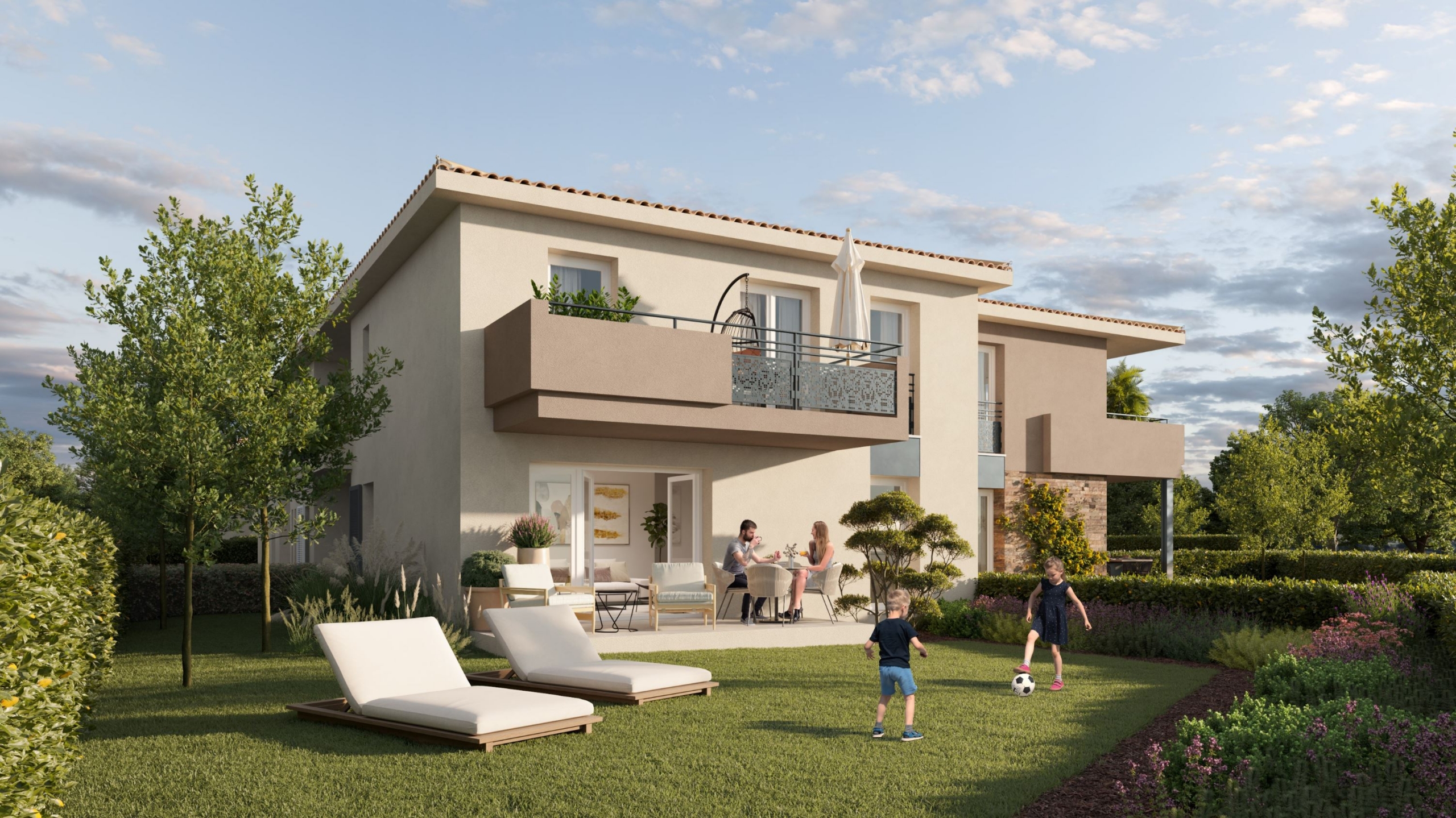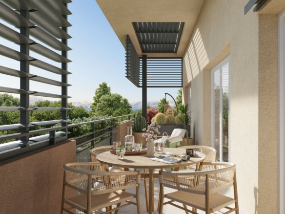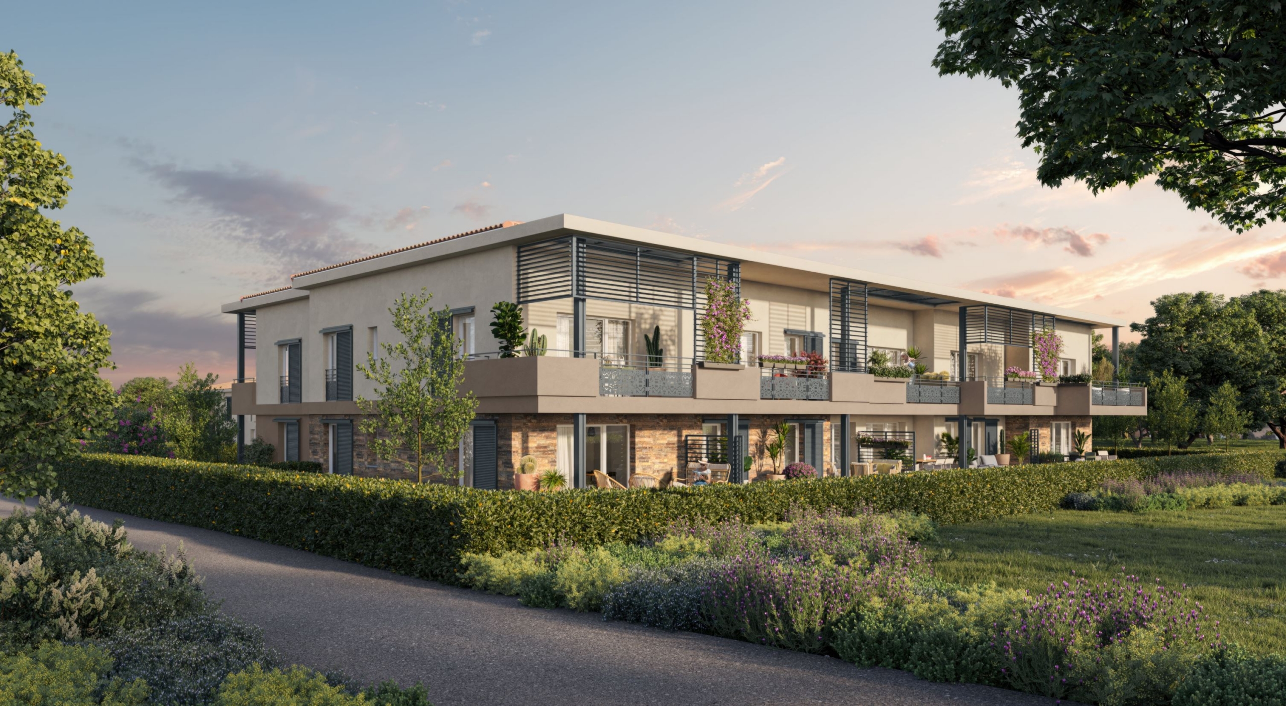 L’architecture développe d’élégantes lignes sobres s’intégrant parfaitement au quartier. Côté jardins, les balcons viennent rythmer par leurs volumes l’architecture moderne. Un jeu décoratif sur les garde-corps assure intimité, protection solaire et donne une esthétique élancée aux terrasses. Sur un socle en béton matricé, les façades déroulent de grands aplats d’enduits aux tons beige clair captant parfaitement la lumière et beige foncé sur les terrasses. Une toiture de tuiles flammées couronne de manière provençale la résidence.