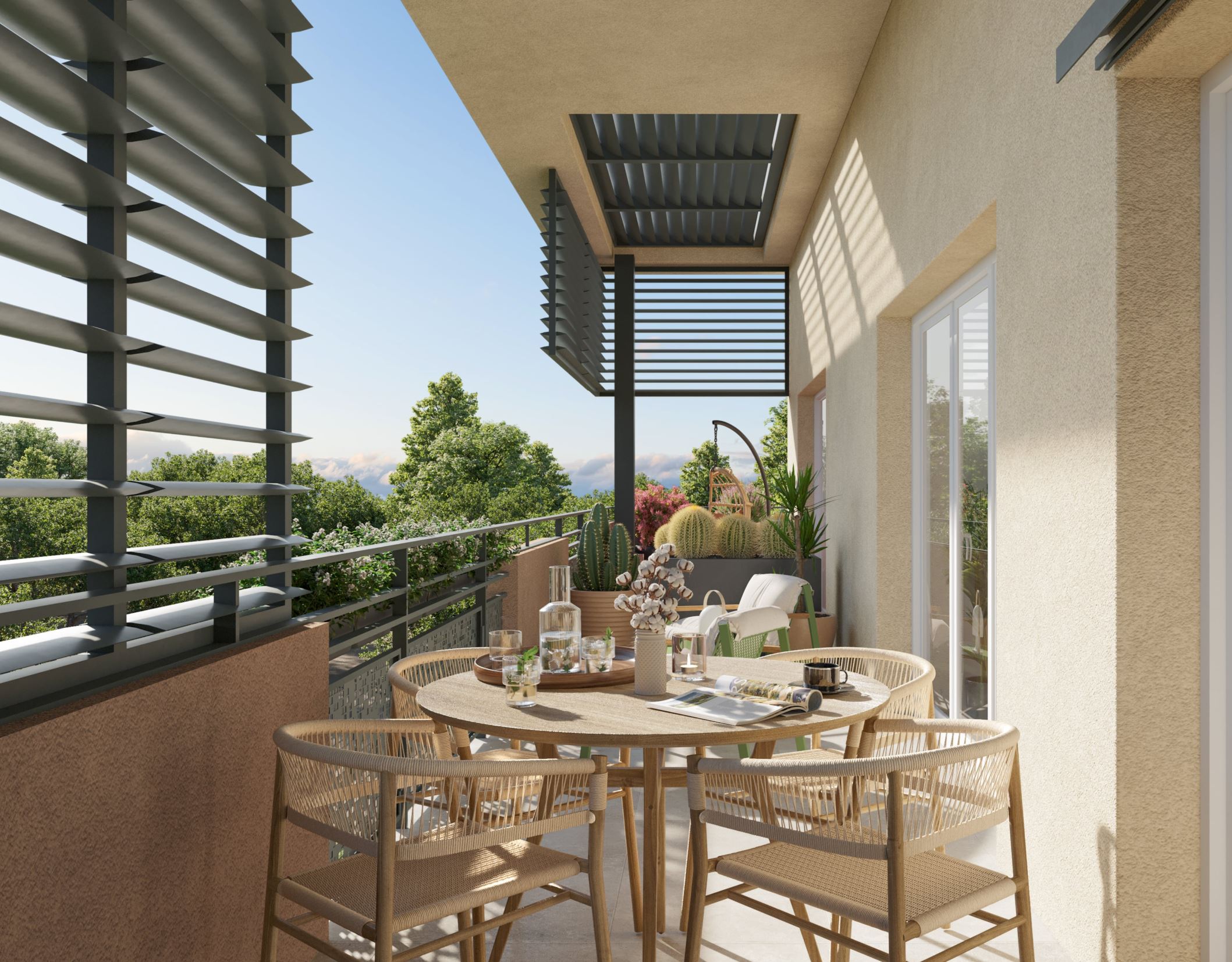 La résidence a été conçue sous le signe de la sérénité, tel un écrin de nature. Une symphonie de couleurs et senteurs d’une nature changeant au gré des saisons s’ouvre face à la résidence. Oliviers, pins d’Alep, chênes verts, Magnolia, Cèdres, Micocouliers… sculptent une architecture végétale et offrent un cocon de verdure au regard des résidents.